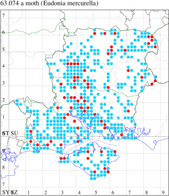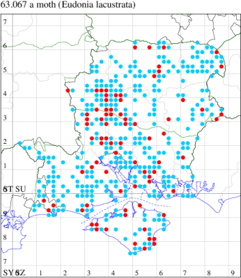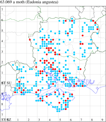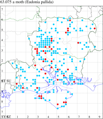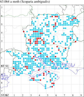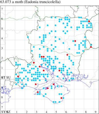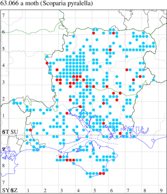 Historically associated with coastal sand-dunes and rough ground throughout the British Isles, this species in recent decades has been increasingly common inland. This picture is mirrored in Hampshire and on the Isle of Wight and it is generally regular to traps across the two counties, and is the only scopariid to be seen in winter. Wingspan 17-22 mm. Easily recognised by the narrow, pointed, brown-tinted forewing [Goater]. Larva feeds on various mosses, often on walls and sand dunes.