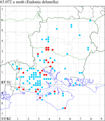 Common in a wide range of habitats throughout most of Britain, south of the Scottish Highlands. Common across much of Hampshire and the Isle of Wight. Wingspan 16-18 mm. Similar to Eudonia mercurella, but that species has slightly narrower, more pointed forewing, is usually darker coloured, and subterminal line is not interrupted [Goater]. Larva feeds on various mosses, often on walls and tree trunks.