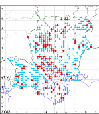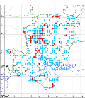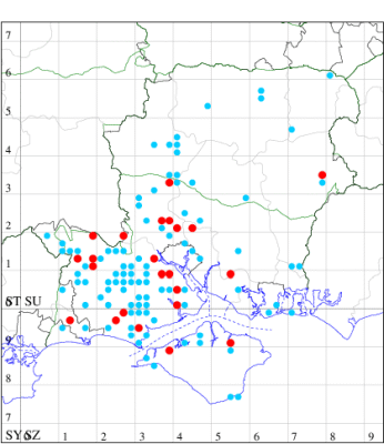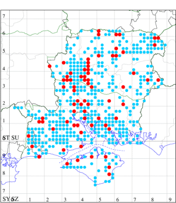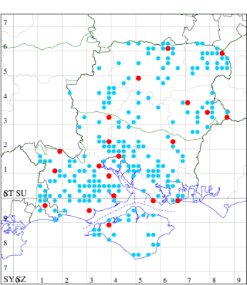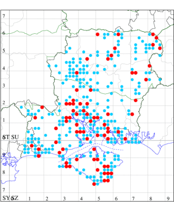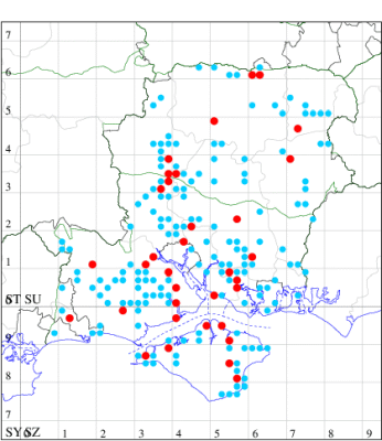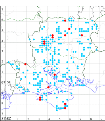 For the maps, all records prior to 2022 are shown by a blue dot (the larger the dot, the more recent), with the current year's records shown in red. As previous records are superimposed on any report for 2022, new sites have greater emphasis (i.e. will show as 'more red').