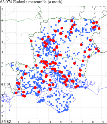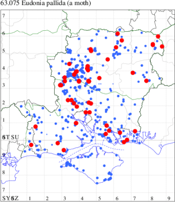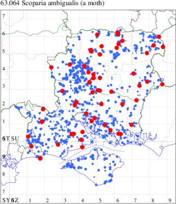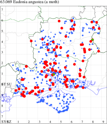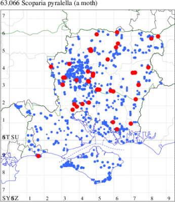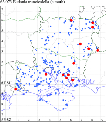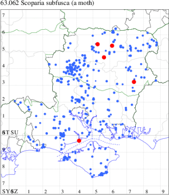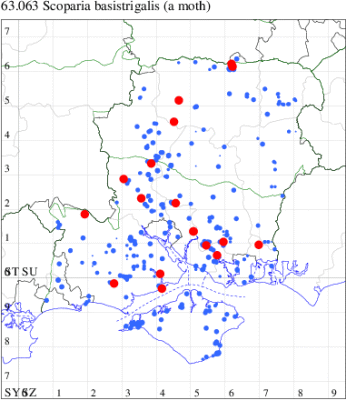 Historically associated with coastal sand-dunes and rough ground throughout the British Isles, this species in recent decades has been increasingly common inland. This picture is mirrored in Hampshire and on the Isle of Wight and it is generally regular to traps across the two counties, and is the only scopariid to be seen in winter. Wingspan 17-22 mm. Easily recognised by the narrow, pointed, brown-tinted forewing [Goater]. Larva feeds on various mosses, often on walls and sand dunes.