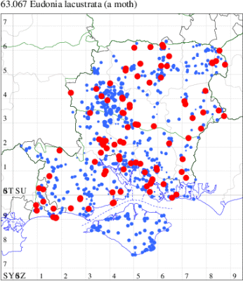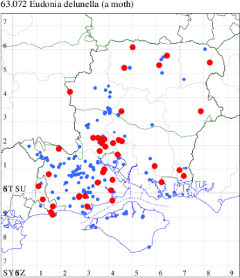 Common in a wide range of habitats throughout most of Britain, south of the Scottish Highlands. Common across much of Hampshire and the Isle of Wight. Wingspan 16-18 mm. Similar to Eudonia mercurella, but that species has slightly narrower, more pointed forewing, is usually darker coloured, and subterminal line is not interrupted [Goater]. Larva feeds on various mosses, often on walls and tree trunks.