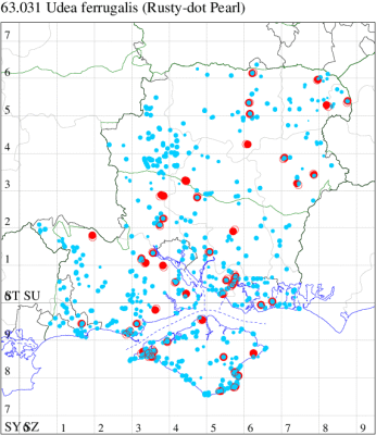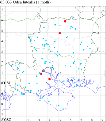 Common in thickets, copses and hedgerows throughout the British Isles. Frequently recorded and well distributed across much of Hampshire and the Isle of Wight. Wingspan 23-26 mm. Slate-coloured overall appearance and weak markings distinguish from other Udea species, lack of white patch between the stigmata distinguish from U. olivalis. Larva feeds on various herbaceous and woody plants