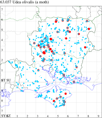 For the maps, all records prior to 2020 are shown by a blue dot (the larger the dot, the more recent), with the current year's records shown in red. As previous records are superimposed on any report for 2020, new sites have greater emphasis (i.e. will show as 'more red').