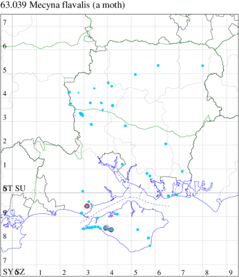 VC11: Ashurst, NF, one, 19 Jul; one, 23 Jul; one, 31 Jul (SAB); Totton, one, 01 Jul; one, 07 Jul; one, 09 Jul; one, 12 Jul; one, 17 Jul; one, 20 Jul; two, 21 Jul; two, 23 Jul; one, 27 Jul; two, 30 Jul; one, 31 Jul; one, 08 Aug (LH); Romsey, one, 26 Jun (SLay); two, 18 Jul (MB); Blackfied, one, to lighted window, 21 Jul (PGS); Southampton, one, to UV, 30 Jul (JVet); one, 20 Jul (MEdg); West End, one, 16 Jul (PAB); Sholing, Southampton, one, new to garden, 25 Jun (ARC); Fareham, one, 06 Jul (ADT); one, to actinic, 15 Jul (MLO); two, 15 Jul; one, 16 Jul; one, 26 Jul (KJW); Portchester, one, 15 Jul; one, 16 Jul (JGe); Portsmouth, one, 25 Jun; one, 21 Jul; one, 06 Aug (IRT); Bournemouth, present, field observation, 22 Jul (iNat); Tuckton, Bournemouth, one, 09 Jul; one, 28 Jul; one, to actinic, 13 Aug (APar); Burton, nr Christchurch, four, 31 Jul; two, 07 Aug; one, 11 Aug (JSw); Sway, one, 24 Jun; five, 25 Jun; two, 01 Jul; one, 02 Jul (SKe); Milford on Sea, two, 31 Jul; one, 05 Aug; one, 14 Aug (MMcM); Pennington, one, 23 Jul (RFC); Southsea, one, 15 Jul; two, 17 Jul; one, 28 Jul; one, 29 Jul; one, 01 Aug; one, 02 Aug; one, 04 Aug; two, 10 Aug (JGe);