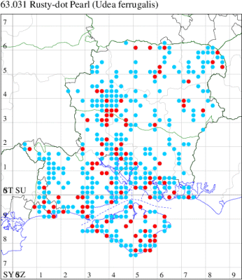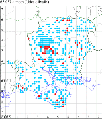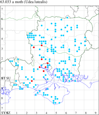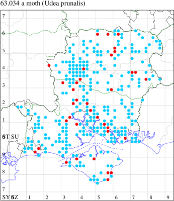 Common in thickets, copses and hedgerows throughout the British Isles. Frequently recorded and well distributed across much of Hampshire and the Isle of Wight. Wingspan 23-26 mm. Slate-coloured overall appearance and weak markings distinguish from other Udea species, lack of white patch between the stigmata distinguish from U. olivalis. Larva feeds on various herbaceous and woody plants