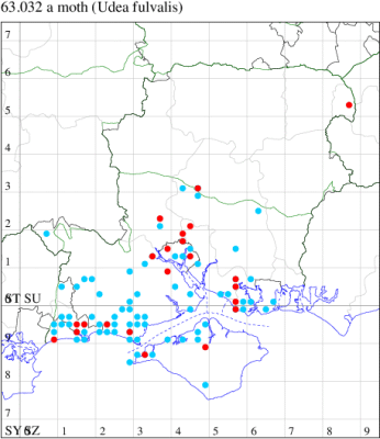 Formerly considered a migrant to southern England from mainland Europe, in some years arriving in sufficient numbers to breed, it now has become established since the mid 1990s predominantly along the south coast of Hampshire inland into the New Forest, and along the north shore of the Isle of Wight; it is spreading northwards and has now reached the VC11/VC12 boundary, and one in the north-east in 2022 represents the first incursion from the Sussex heaths to the east. Wingspan 24-29 mm. Similar in structure, size and markings to U. prunalis, but differs in the dull fulvous brown coloration of the forewing, which is slaty grey in U. prunalis, and in the wider submedian sinus of second line [Goater]. Larva feeds on Black Horehound, Meadow Clary, Red Campion and White Campion.