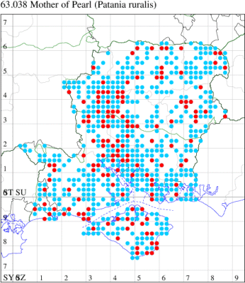 Common in rural gardens, waste ground and rough pastures throughout the British Isles. Widespread and common in Hampshire and on the Isle of Wight. Wingspan 33-37 mm. One of the largest and most familiar pyralids, wings have an opalescent sheen, most obvious in sunshine, which gives rise to the vernacular name. Larva feeds predominately on Stinging Nettle, living within a spun or rolled leaf.