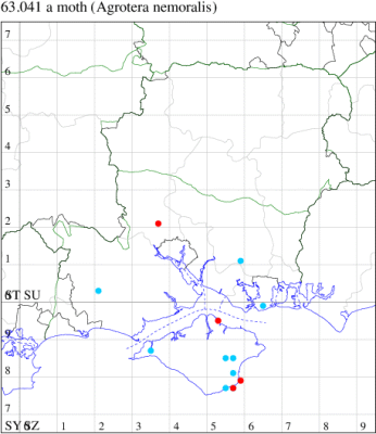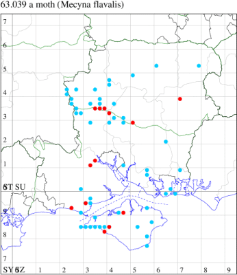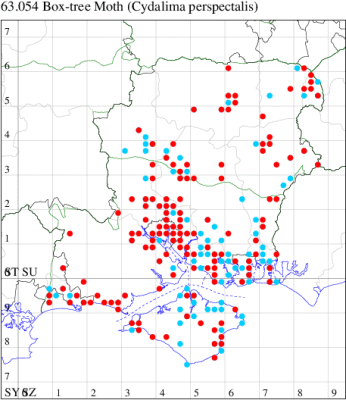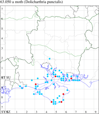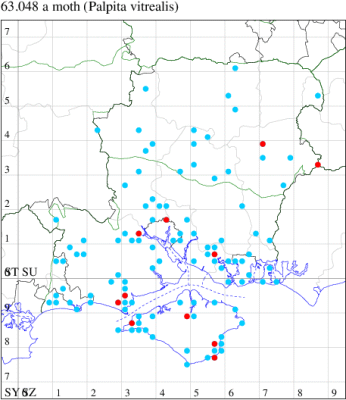 For the maps, all records prior to 2021 are shown by a blue dot (the larger the dot, the more recent), with the current year's records shown in red. As previous records are superimposed on any report for 2021, new sites have greater emphasis (i.e. will show as 'more red').