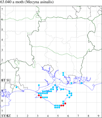 VC11: Marchwood, one, 07 Aug; one, 13 Aug (CTha); Totton, one, 16 Jul; one, 25 Jul; one, 28 Jul; one, 04 Aug; one, 16 Aug (LHan); Millbrook, one, 22 Jul (JWal); Woodley, one, 27 Jul; one, 30 Jul (NBin); Chandlers Ford, one, field observation, 03 Aug (AMur det. MJW); Swaythling, Southampton, one, 22 Aug (MEdg); Bitterne, Southampton, one, 24 Jul (PAB); Allbrook, one, field observation, 12 Jul (SIng); Lee-on-Solent, one, 14 Aug; one, 17 Aug; one, 20 Aug; one, 25 Aug (IHrg); Fareham, one, 16 Jul; one, 14 Aug; one, 28 Aug (ADT); one, 11 Aug (IMcP); two, to light, 25 Jul; two, to light, 29 Jul; one, to light, 31 Jul; one, to light, 04 Aug (KJW); one, indoors, 24 Jul (RJD); Bournemouth Centre, one, indoors, 23 Aug; Jumpers Common, Christchurch, one, field observation, 30 Jun (MJef); Tuckton, Christchurch, one, 17 Jul; one, 04 Aug; one, 11 Aug; one, 29 Aug; one, 08 Sep (APar); Burton, nr Christchurch, two, 17 Aug (JStw); New Milton, one, indoors, 30 Jul (RPH); Milford on Sea, one, 20 Aug (MMcM); Browndown Coastal Ranges, one, gen det, 20 Aug (RJD, MLO, DWal, KJW);