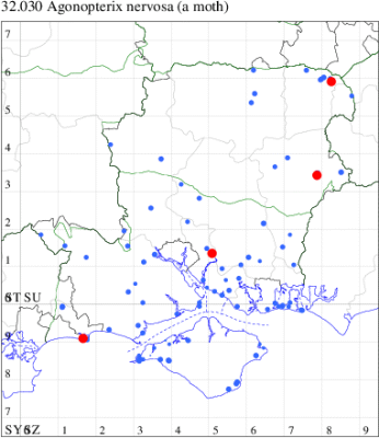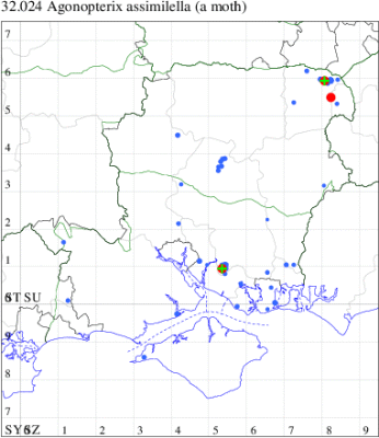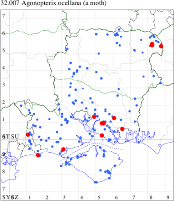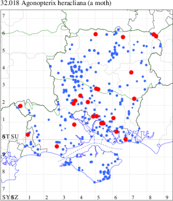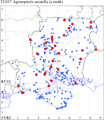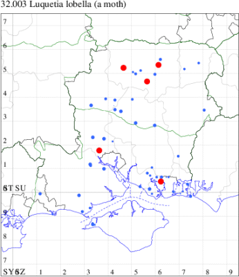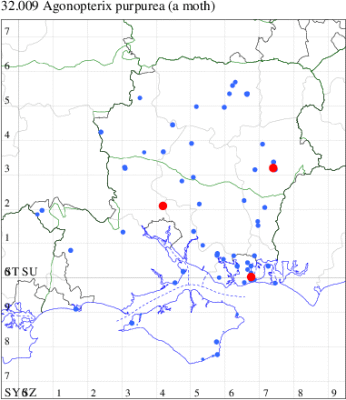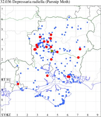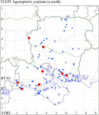 VC11: Marchwood, one, 09 Apr; one, indoors, 28 Oct (CTha); Blackfield, one, 23 Sep (SJJ); Blackfied, one, to a lighted window, 16 Apr (PGS); Botley, one, 17 Mar; one, 28 Mar (SLB); Portsmouth, one, 19 Aug (IRT); Old Winchester Hill*, one, female gen.det. , 28 Apr (F.M.G. det. RJD);