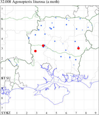 VC12: Barton Stacey, one, 11 Sep (GCE); Alton, one, to artificial light, 16 Sep (DBO); Hammer Vale, Woolmer, one, indoors, 06 Sep (ASwa); Fleet Pond, one, 10 Aug (MHals); Blackwater, one, 27 Jun (BGD)