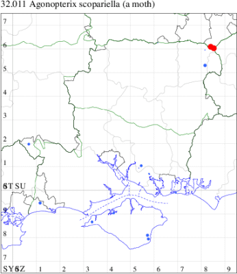 In Hampshire the foodplant of this species is local and the moth is even rarer: it has been recorded in the past from Botley Wood (1990) and Cranmore (1981). However, it was found at Needs Ore in 1985 and a one-day survey in June 2015 found 56 larvae in six locations, and it is likely still to be present. Records were absent from the Isle of Wight since 1969, before it was found to be relatively numerous in the Newtown Common area in 2013 and there have been regular reports since - the geographical proximity of this site with Needs Ore, a stone's throw across the Solent, is probably not a coincidence. Wingspan 18-21 mm. The most likely confusion species is A. scopariella, which see for differences. Larva feeds on Dyer's Greenweed, living within a spun or rolled leaf.