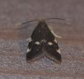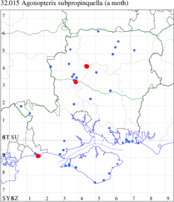 Nationally scarce (Nb) in woodland and hedgerows in parts of England, except the north-east, and in north Wales. A scarcely seen insect in Hampshire with a very scattered distribution, mainly away from the chalk; there are two old records from the Isle of Wight. Wingspan 11-14 mm. The three pale, evenly-spaced spots on each forewing make this a distinctive member of the Oecophoridae. Larva feeds on dead wood, perhaps most frequently of Hazel.