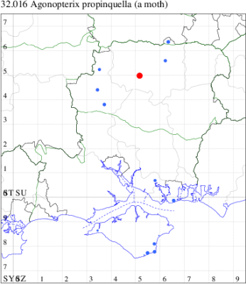 Local in waste ground and rough grassland throughout much of England, Wales, southern Scotland and southern Ireland. In Hampshire and on the Isle of Wight there have been very few recent records of this species, and it has been recorded in recent years only from Sherborne St John and Blagden Lodge, Wildhern, in the north of the county, and Shanklin on the Isle of Wight. Wingspan 16-19 mm. The most likely confusion species is A. subpropinquella, which see for differences. Larva feeds on Creeping Thistle and Spear Thistle, living within a spun or rolled leaf.