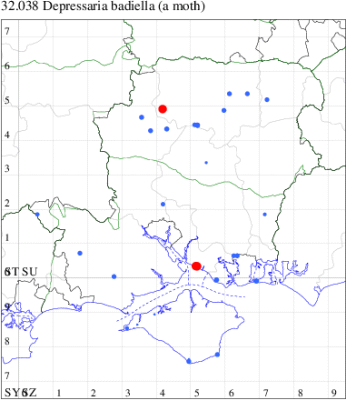 VC11: North Solent NNR*, one, field observation, gen det, specimen retained. , 09 Dec; Needs Ore NNR*, one, seen by day, male, at rest in the toilet block. Genitalia 10,550., 09 Dec (ADT det. RJD);