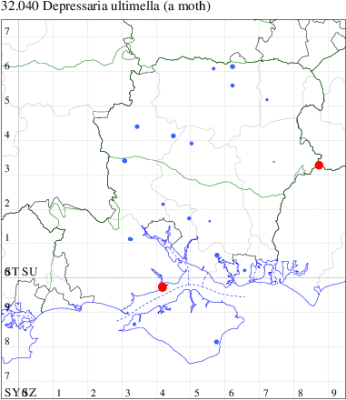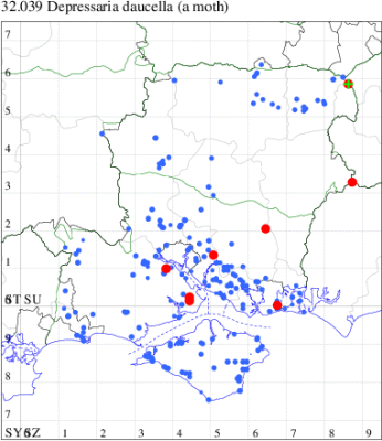 Local in ditches, marshes and water meadows, and on river-banks in southern England from Kent to Cornwall, through central England as far north as Lancashire and north-east Yorkshire; also in Wales and southern Ireland. In Hampshire there are a few scattered records in both the north and south, and first recorded on the Isle of Wight at Freshwater in 2010. Wingspan 16-21 mm. Resembles D. daucella, which see for differences. Larva feeds on stems and leaves of Fool's Water-cress, Greater Water-parsnip, Hemlock Water-dropwort and Fine-leaved Water-dropwort, overwintering as an adult.