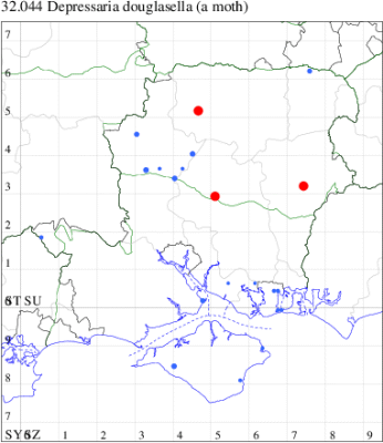 Nationally scarce (Nb) in grassland and waste ground throughout much of England. In Hampshire and on the Isle of Wight recorded from a handful of sites, and quite rare in North Hampshire. Wingspan 17-21 mm. The main confusion species are D. pulcherrimella, in which the angle made by the pale fascia on the forewing forms a right-angle (obtusely angled in A, douglasella), and D. sordidatella, which differs in the slightly glossy, less heavily marked forewing and the darker head, thorax and tegulae (MBGBI Vol 4 part 1). Larva feeds on Wild Carrot, Wild Parsnip and Upright Hedge-parsley, living between leaves spun together with silk.