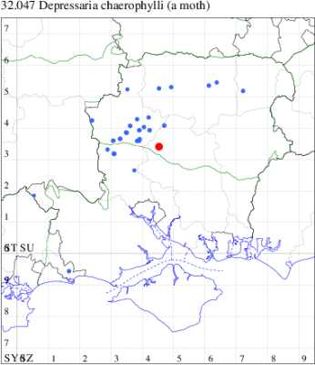Local on downland and dry grassland throughout much of southern England and Wales, north to Lancashire. In Hampshire evidently uncommon, and absent from much of the south-west, with no recent records from the Isle of Wight. Wingspan 11-15 mm. A useful field mark is the vertical line from dorsum to upper margin of cell (MBGBI Vol 4 part 1). Larva mines leaves of Wild Carrot, Rough Chervil, Cow Parsley and Upright Hedge-parsley, subsequently living within a spun leaf.