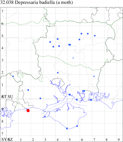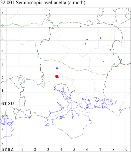 Nationally scarce (Nb) in woodland and hedgerows in parts of England, except the north-east, and in north Wales. A scarcely seen insect in Hampshire with a very scattered distribution, mainly away from the chalk; there are two old records from the Isle of Wight. Wingspan 11-14 mm. The three pale, evenly-spaced spots on each forewing make this a distinctive member of the Oecophoridae. Larva feeds on dead wood, perhaps most frequently of Hazel.