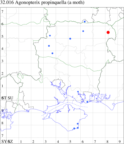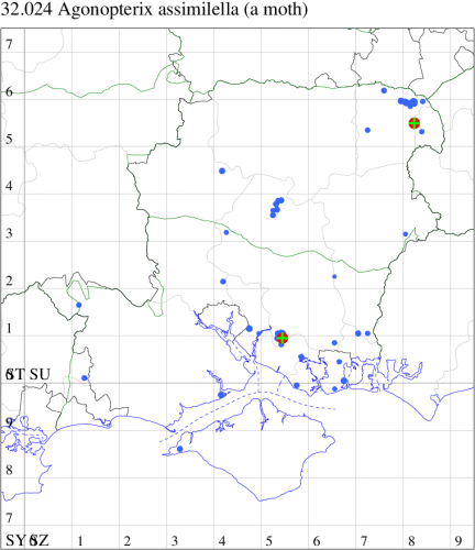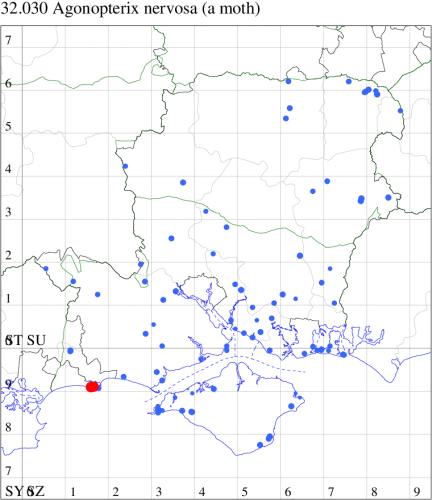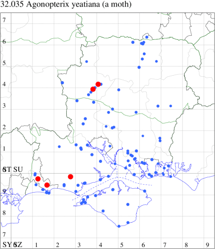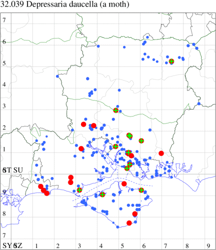 VC11: Woodlands, NF, one, 31 Jul (RBW); Stanbridge Earls, one, 16 Mar (JRM); Romsey, two, 16 Mar (NRJ); Wildern LNR, Hedge End, larva, two, field obs., on Hemlock Water Dropwort, 22 Jun (TCrw); Titchfield Haven NNR, larva, one, field obs., 09 Jun (PBarf); Botley Wood, two, worn, det gen, 15 Mar (F.M.G. det. RJD); Stubbington, larva, two, field obs., in spinnings on Hemlock Water-dropwort, 17 May (DPH); Funtley, two, 10 Feb; four, 14 Feb; four, 15 Feb; four, 16 Mar; one, 07 May; one, 09 May; one, 11 May (TDC); Botley Wood, larva, one, field obs., 16 Jun (DPH); Claylands LNR, Bishop's Waltham, larva, present, field obs., on Hemlock water-dropwort, 31 May; Bishop's Waltham, larva, present, field obs., 08 Jun (DTru); Waterlooville, one, 03 Apr (DWhe); St Clair's Meadow NR, Droxford, larval spinning, present, field obs., spinnings and larvae on hemlock water dropwort, , 03 Jun (RJD); Christchurch: Cross Way, one, 16 Feb; four, 27 Feb; three, 08 Mar; one, 10 Mar; four, 13 Mar; five, 17 Mar; two, 19 Mar; one, 20 Mar; one, 25 Mar (LPyk); Christchurch, three, 07 Apr (APard); Hengistbury Head NNR, one, 28 May (MJef); one, 11 Jul (BKin det. MJef); one, 12 Jul (RPH); Hordle, one, field obs., 14 Mar; Sway, one, 11 Mar; one, 12 Mar; one, 13 Mar; one, 15 Mar; one, 11 Aug; one, indoors, 29 Feb 29 Feb (SKee); Pennington, two, 10 Feb; one, 15 Feb; one, 25 Mar; one, 05 Apr; one, 10 Aug (RFC); Keyhaven Marshes, larva, one, at dusk, larvae in spun flowers of Hemlock Water Dropwort, 08 Jun (WLan);