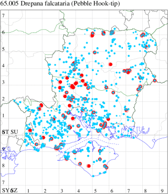 Common in woodland, especially of birch, heathland and gardens throughout Britain. Widespread and common in Hampshire and on the Isle of Wight. Wingspan male 36-40 mm, female 40-43 mm. In Scotland moths are distinctly straw-coloured with outer markings darker (ssp. scotica), elsewhere, occasional individuals can be very pale (f. pallida), but only likely to be confused with Dusky Hook-tip D. curvatula, a rare immigrant from Europe, which is darker and has the three discal spots roughly the same size (in falcataria, the outer discal spot is much larger then the other two). Larva feeds on Downy and Silver Birch, over-wintering as a pupa.