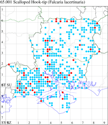 Common in woodland, especially of birch, heathland and gardens throughout Britain. Widespread and common in Hampshire and on the Isle of Wight. Wingspan male 36-40 mm, female 40-43 mm. In Scotland moths are distinctly straw-coloured with outer markings darker (ssp. scotica), elsewhere, occasional individuals can be very pale (f. pallida), but only likely to be confused with Dusky Hook-tip D. curvatula, a rare immigrant from Europe, which is darker and has the three discal spots roughly the same size (in falcataria, the outer discal spot is much larger then the other two). Larva feeds on Downy and Silver Birch, over-wintering as a pupa.