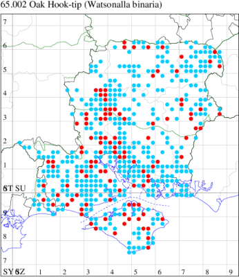 Local in beech woodland throughout England and Wales. Frequent where beech grows in the New Forest and on the chalk in Hampshire and the Isle of Wight, although rare elsewhere in these counties. Wingspan male 26-32 mm, female 30-35 mm. Main confusion species is Oak Hook-tip W. binaria, but smaller and with a broad dark median fascia across the forewing. Larva feeds on Beech, over-wintering as a pupa.