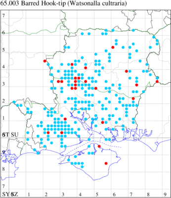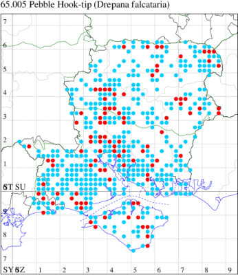 Rare immigrant from mainland Europe, appearing in southern and eastern England. First recorded at Dungeness, Kent, in August 1960. In Hampshire the UK's fifth record was discovered at Totton in August 1991. Recorded on the Isle of Wight for the first time at Freshwater in 2002. Wingspan male 37-40 mm, female 40-49 mm. Can easily be overlooked as a dark Pebble Hook-tip D. falcataria, but in that species the outer discal spot on the forewing is much larger than the other two, and on the hindwing the cross-lines in Pebble Hook-tip are more jagged and the wing is noticeably paler towards the costa (MBGBI Vol 7 part 2). Larva feeds on Silver Birch, Downy Birch, Alder and Oak, no evidence of breeding in the UK.
