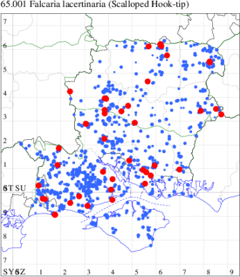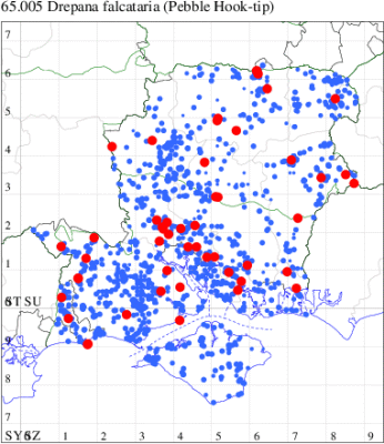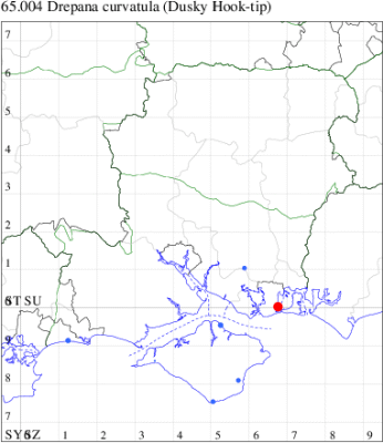 Rare immigrant from mainland Europe, appearing in southern and eastern England. First recorded at Dungeness, Kent, in August 1960. In Hampshire the UK's fifth record was discovered at Totton in August 1991. Recorded on the Isle of Wight for the first time at Freshwater in 2002. Wingspan male 37-40 mm, female 40-49 mm. Can easily be overlooked as a dark Pebble Hook-tip D. falcataria, but in that species the outer discal spot on the forewing is much larger than the other two, and on the hindwing the cross-lines in Pebble Hook-tip are more jagged and the wing is noticeably paler towards the costa (MBGBI Vol 7 part 2). Larva feeds on Silver Birch, Downy Birch, Alder and Oak, no evidence of breeding in the UK.