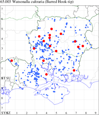 Local in beech woodland throughout England and Wales. Frequent where beech grows in the New Forest and on the chalk in Hampshire and the Isle of Wight, although rare elsewhere in these counties. Wingspan male 26-32 mm, female 30-35 mm. Main confusion species is Oak Hook-tip W. binaria, but smaller and with a broad dark median fascia across the forewing. Larva feeds on Beech, over-wintering as a pupa.