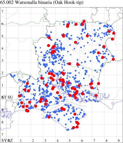 For the maps, all records prior to 2024 are shown by a blue dot (the larger the dot, the more recent), with the current year's records shown in red. As previous records are superimposed on any report for 2024, new sites have greater emphasis (i.e. will show as 'more red').