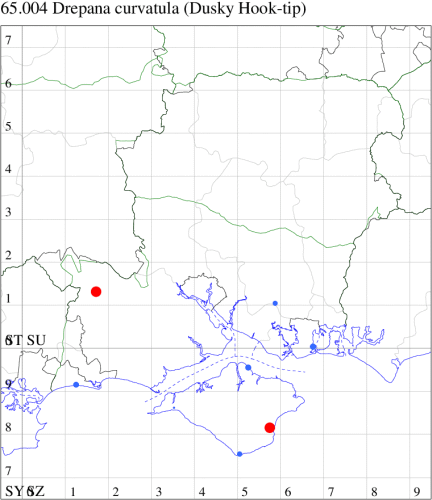 Rare immigrant from mainland Europe, appearing in southern and eastern England. First recorded at Dungeness, Kent, in August 1960. In Hampshire the UK's fifth record was discovered at Totton in August 1991. Recorded on the Isle of Wight for the first time at Freshwater in 2002. Wingspan male 37-40 mm, female 40-49 mm. Can easily be overlooked as a dark Pebble Hook-tip D. falcataria, but in that species the outer discal spot on the forewing is much larger than the other two, and on the hindwing the cross-lines in Pebble Hook-tip are more jagged and the wing is noticeably paler towards the costa (MBGBI Vol 7 part 2). Larva feeds on Silver Birch, Downy Birch, Alder and Oak, no evidence of breeding in the UK.