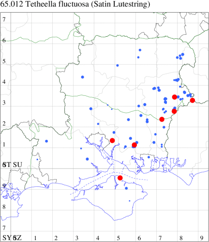 Common in woodland, scrub, heathland and gardens throughout the British Isles. Widespread and common in Hampshire, but rather scarce on the Isle of Wight, with just two records there so far this century. Wingspan 25-34 mm. The main confusion species is Satin Lutestring Tetheella fluctuosa, but differs, for example, in small apical dash, which originates at the apex in Common Lutestring and some way down the costa in Satin Lutestring. Larva feeds on Silver and Downy Birch, over-wintering as a pupa.