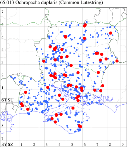 Local in broad-leaved, especially birch, woodland and heathland throughout England and Wales. In Hampshire the population is centred in the extreme south-eastern corner of vice-county 12 (north Hampshire), with scattered records in south Hampshire and on the Isle of Wight. Wingspan 35-38 mm. The main confusion species is Common Lutestring Ochropacha duplaris, which differs, for example, in the small apical dash, which originates at the apex in Common Lutestring, and some way down the costa in Satin Lutestring. Larva feeds on Silver and Downy Birch, over-wintering as a pupa.