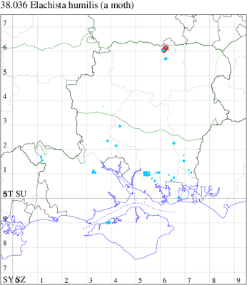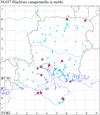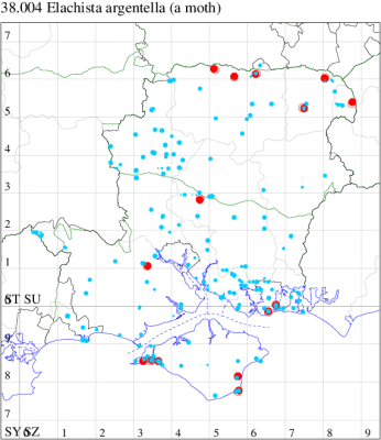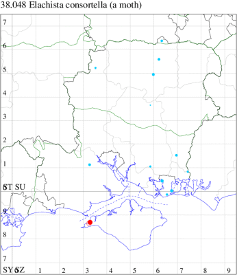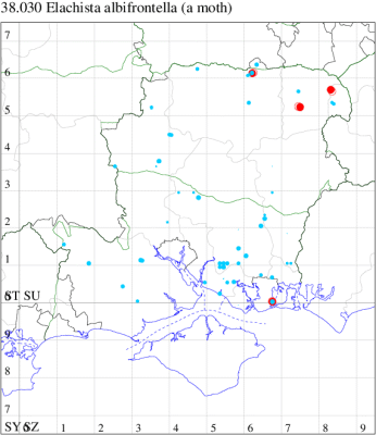 Nationally scarce (Nb) on open grassland and heathland throughout England and Wales. In Hampshire restricted to sites such as Portsdown Hill, Martin Down and Oxenbourne Down, with occasional records elsewhere, including one on the Isle of Wight on Culver Down, Bembridge. Wingspan 7-9 mm. Larva mines leaves of Glaucous Sedge.
