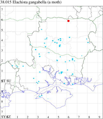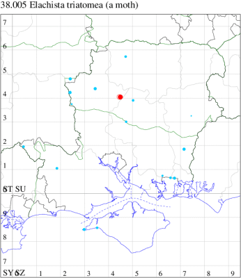 Nationally scarce (Nb) on open grassland in widely scattered localities throughout Britain and Ireland, absent from the extreme north of Scotland and the northern half of Ireland (MBGBI Vol 3). In Hampshire records are thinly distributed across much of the county, and it is no doubt overlooked - recorded from the Isle of Wight for the first time in 2020. Wingspan 7-8 mm. Only reliably recorded by dissection of the genitalia. Larva mines leaves of Annual Meadow-grass.