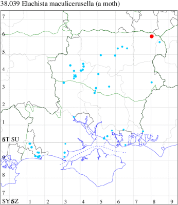 Local in woodland in southern England and Wales, rare elsewhere. Very sparsely, but widely, distributed across Hampshire and the Isle of Wight. Wingspan 9-10 mm. Distinguished from all other unifasciate Elachista species by the dark apical cilia on the forewing (MBGBI Vol 3). Larva mines leaves of Cock's-foot and False-brome.