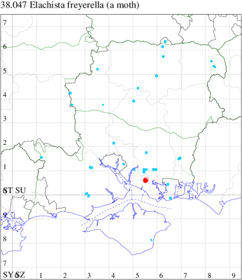 Local in damp meadows and woodland rides throughout the British Isles. In Hampshire recorded regularly only at Botley Wood, elsewhere in the county, and on the Isle of Wight, recorded very occasionally, and absent from many ten-kilometre squares. Wingspan 7-8 mm. Usually impossible to separate from C. consortella and C. stabilella without dissection of the genitalia, but C. freyerella tends to be darker with more obvious fasciae. Larva mines leaves of various grasses.