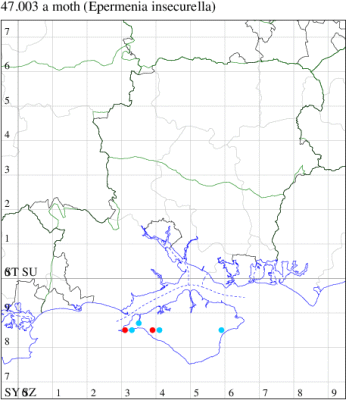 Vulnerable (proposed as a future Red Data Book species) on limestone grassland and chalk downland in England, south of a line from the Severn estuary to The Wash, a priority species under the UK Biodiversity Action Plan. In our area there are four very old records on the Isle of Wight, until rediscovered on Mottistone Down on the island in May 2018. Wingspan 9-11 mm. Flies in late afternoon sunshine. Larva feeds on Bastard Toadflax Thesium humifusum.