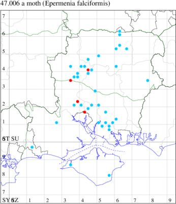 Local in damp woodland, marshes and freshwater margins throughout much of southern England, rarely in Wales. In Hampshire locally common only at Ampfield and Emer Bog, and also at Botley Wood. Not recorded from the Isle of Wight since 1900. Wingspan 12-14 mm. Like several other Epermenia species, the dorsum has a number of prominent hump-like scale-teeth, in E. falciformis there are two, occasionally three, black scale-teeth, the largest one at one-third (MBGBI Vol 3). Larva feeds within stems and leaves of Wild Angelica and Ground Elder, living within a spun or rolled leaf.