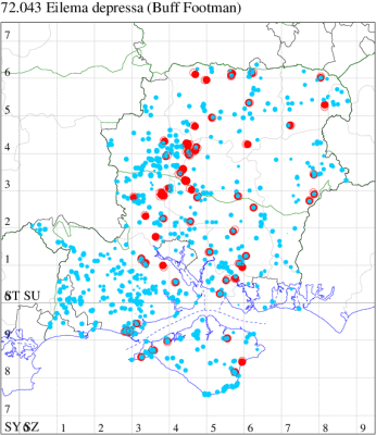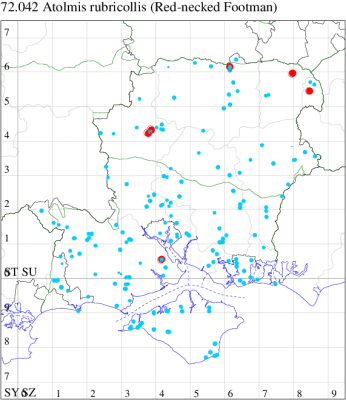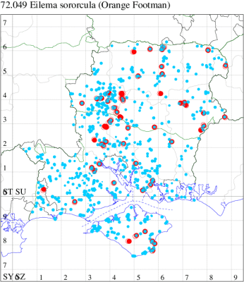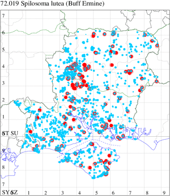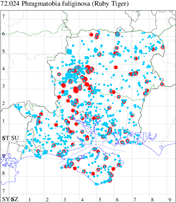 For the maps, all records prior to 2020 are shown by a blue dot (the larger the dot, the more recent), with the current year's records shown in red. As previous records are superimposed on any report for 2020, new sites have greater emphasis (i.e. will show as 'more red').