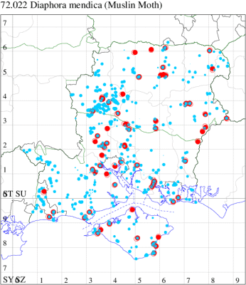 First recorded on the Isle of Wight as a migrant in 1935, there were no further sightings in our area until one in Fareham, Hampshire on 12 August 1987. Low level residence was first suspected in the early 1990s, since when it has increased year on year on the island and is now locally frequent there (light traps in Ventnor have turned up 50-100 individuals on one night). With this, it was to be expected that frequency of sightings would increase on the mainland across the Solent, and it appears now to be resident (supplemented by dispersal from Wight) across the south Hampshire coast. It is making inroads inland and is increasingly reported across the county: it is very common in Surrey and East Berkshire, where populations have been expanding west from the London area, which may have originated from captive breeding releases, and the influx into north-east Hampshire more than likely originates from that source.