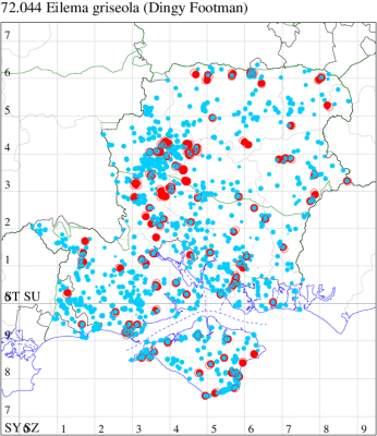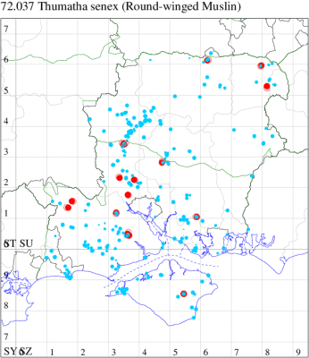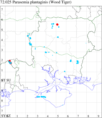 VC11: Godshill, NF, present, 12 Jul (RBW, MWa); Breamore*, one, field observation, 06 Jul (SWan); Pignal Inclosure, NF, one, field observation, 24 Jun (JAda); Pig Bush, NF, one, 18 Jul; Culverley, NF, one, 19 Jul (CL); Marchwood, one, 14 Jul (CTh); Woodlands, New Forest, present, 13 Jun (RBW); Stanbrige Earls, one, to actinic, 16 Jun (JRMi); Timsbury, one, to a lighted window, 28 May (TRa); Romsey, one, 19 Jun (MB); Kings Somborne, one, to actinic, 11 Jun; Hursley, one, to actinic, 11 Jun; Stockbridge Down NT, one, to actinic, 19 Jun; three, to actinic, 19 Jun; three, to actinic, 19 Jun; two, to actinic, 19 Jun (GCE); Dibden Purlieu, one, to actinic, 01 Jun; one, to actinic, 04 Jun (RAC); Southampton, one, 07 Jun (MEdg); Wickham, one, 13 Jun (JRDS);