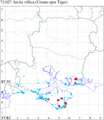Local on river-banks, and in fens, marshes and damp meadows throughout south-western England and south Wales. In Hampshire still common in the Avon, Test, Itchen and Wey valleys and occasionally wanders elsewhere. Not recorded from the Isle of Wight to date. Wingspan 52-58 mm. Day-flying, but fairly frequent at over-night light traps. Usually, the bright red underwing precludes confusion with other tiger moths, however it occasionally has a yellow underwing, when it superficially resembles Cream-spot Tiger Arctia villica, but Cream-spot Tiger has a large white basal patch and is a more slender moth. Larva feeds on Common Comfrey, Hemp-agrimony, Stinging Nettle, Bramble, Honeysuckle and Meadowsweet.