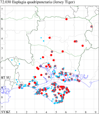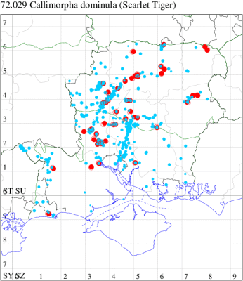 Local on clifftops, undercliffs, saltmarshes and sand-dunes in southern England and South Wales, predominantly coastal. In Hampshire and on the Isle of Wight more or less confined to the coasts of vice-counties 10 and 11, where it is locally fairly common. Wingspan 50-66 mm. Could be confused with the occasional Scarlet Tiger Callimorpha dominula which has yellow hindwing. Larva feeds on White Dead-nettle, Black Horehound, Common Ragwort and Common Cow-wheat.
