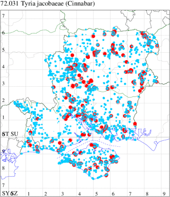 Common on grassland, sand-dunes, heathland, gardens and woodland rides throughout much of England and Wales, rare in Scotland, a species of conservation concern under the UK Biodiversity Action Plan. In Hampshire and on the Isle of Wight widespread and usually common, especially in the larval stage, on dunes, downs, open woodland and other places where the foodplant grows. Wingspan 35-45 mm. Unmistakable. Larva feeds on Common Ragwort, occasionally also on Oxford Ragwort, over-wintering as a pupa.