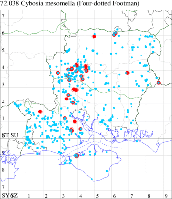 Local in broad-leaved woodland in southern England and western Wales, sporadically as far north as Ross-shire and the Isle of Man. It is probable that the population is from time to time reinforced by immigration. In Hampshire and on the Isle of Wight resident at low density in the New Forest and an uncommon, presumed, immigrant elsewhere. The individual pictured here was taken in the Isles of Scilly, where it is much more frequent. Wingspan male 35-40 mm, female 40-55 mm. Although only the female has spots, the large size precludes confusion with other Lithosiinae. The unspotted male is much more common to light then the female. Larva feeds on lichens growing on oak trees.