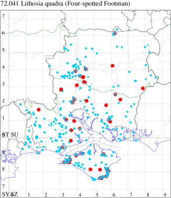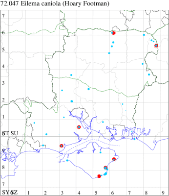 Nationally scarce (Nb) on sea cliffs and shingle beaches, and inland on quarries, from Kent to Anglesey. In Hampshire and on the Isle of Wight first recorded on the Island in 1992 and, on the mainland, in 1997, now increasingly seen in the north-east of the county where it is spreading from the east. Wingspan 28-35 mm. Very similar to Scarce Footman E. complana, but hindwing very pale yellowish grey (ochreous yellow in Scarce Footman), a feature which is difficult to see on live specimens. Larva feeds on various lichens, often on rocks.
