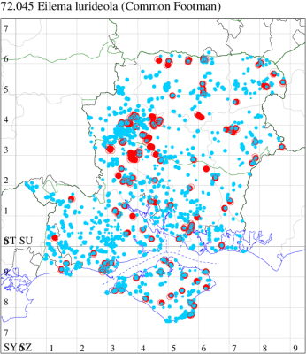 Common wherever there are lichens, in gardens, farmland, marshes and woodland throughout England, Wales and southern Scotland. Widespread and common in Hampshire and on the Isle of Wight. Wingspan 31-38 mm. Wing-shape and posture of live specimens is a far more reliable way of separating the various Eilema species than examination of prepared specimens, and familiarity with E. lurideola is the key to the identification of the other Eilema species; the most likely confusion species is Dingy Footman E. griseola, which see. Larva feeds mainly on various lichens, perhaps also on the foliage of various trees and bushes, including Hawthorn and Dogwood.