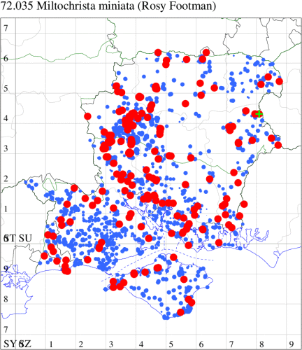 For the maps, all records prior to 2024 are shown by a blue dot (the larger the dot, the more recent), with the current year's records shown in red. As previous records are superimposed on any report for 2024, new sites have greater emphasis (i.e. will show as 'more red').
